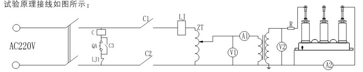 按原理圖將相關儀表和設備連接好。測試前應首先將電流繼電器LJ的整定值調至最小值(作為后備保護),然后將試驗變壓器空載升壓,電流繼電器LJ應不動作,將數字電流表A1的雖程調至5?20A(5KVA及以下容里試驗變壓器可不加限流電阻Rl。